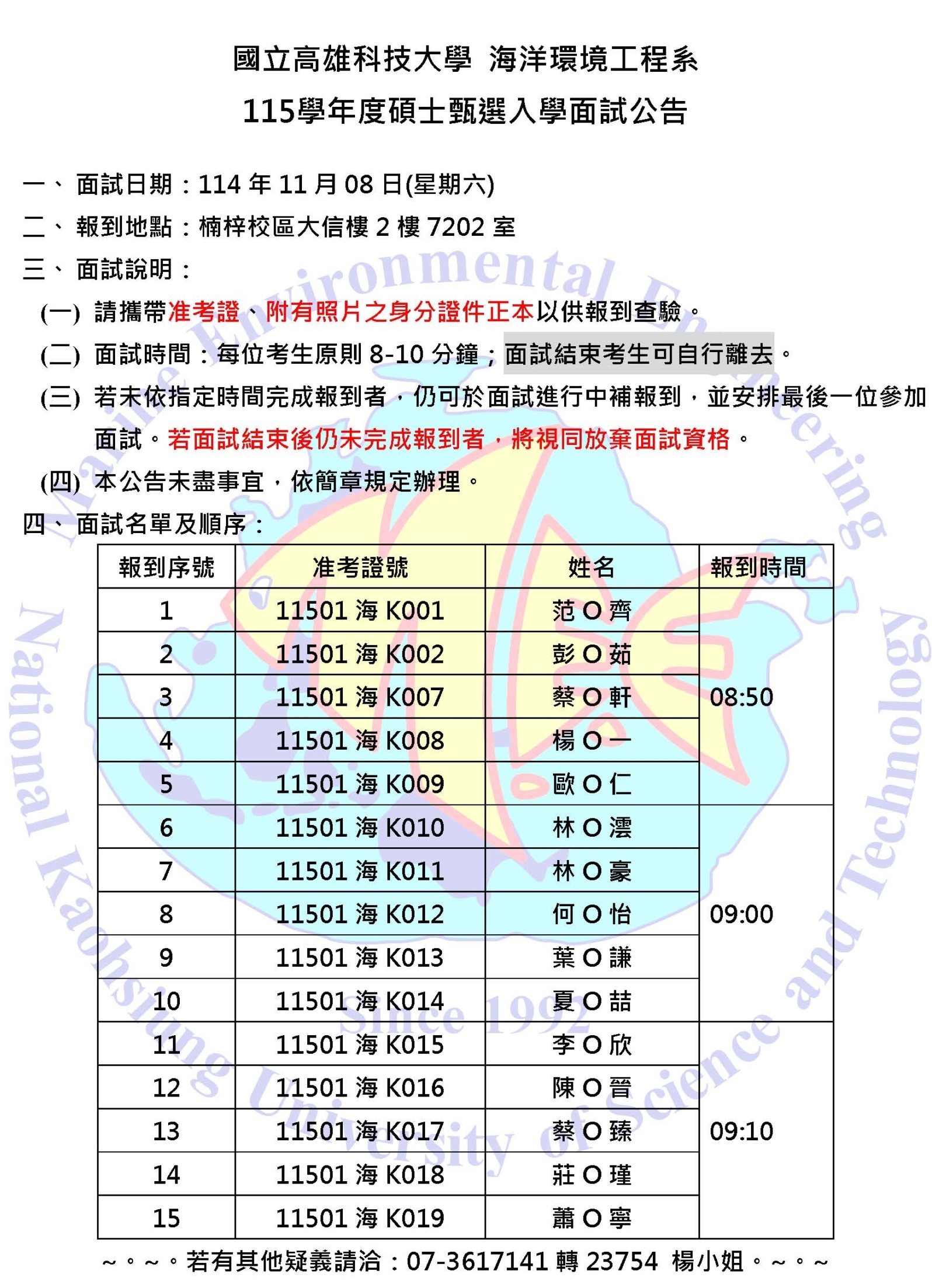 115學年度海洋環境工程系【碩士甄選入學面試名單&流程表】公告2025-10-31 /wp-content/uploads/2024/09/logo-200x200.png 0 0 sujacky /wp-content/uploads/2024/09/logo-200x200.png sujacky2025-10-31 10:34:022025-10-31 10:36:46115學年度海洋環境工程系【碩士甄選入學面試名單&流程表】公告